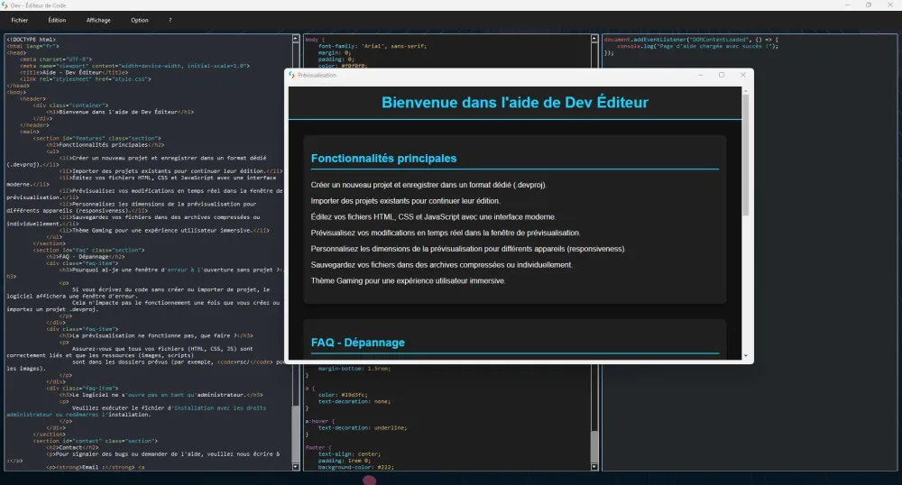 Nous sommes ravis d'annoncer la publication officielle de notre nouveau logiciel Dev - Éditeur de Code, un logiciel moderne et performant conçu spécialement pour les développeurs web, qu'ils soient débutants ou confirmés.